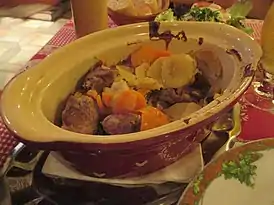 Бекеоффе (фр. baeckeoffe)[2] — блюдо, напоминающее рагу или стью, типичноe для французского региона Эльзас, расположенного на границе с Германией[3][4]. На эльзасском диалекте Baeckeoffe означает «печь пекаря». Это смесь нарезанного картофеля, лука, баранины, говядины и свинины, маринованных на ночь в эльзасском белом вине и ягодах можжевельника, и медленно приготовленных в печи, в запечатанной с помощью хлебного теста керамической форме для запекания. Лук-порей, тимьян, петрушка, чеснок, морковь и майоран — другие часто используемые ингредиенты для придания вкуса и цвета.