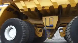 ![]() БелАЗ 75710 с полностью повёрнутыми мостами | ![]() Цилиндры подвески переднего моста |