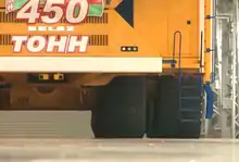 ![]() Над выхлопными трубами: установка вентиляции тормозных резисторов (видны входное и выпускные отверстия центробежного вентилятора). Левее — шкаф управления электрооборудованием | ![]() Установка вентиляции тормозных резисторов. Под ней виден индикатор электронных весов | ![]() Слева от кабины — шкаф управления электрооборудованием, ещё левее — установка вентиляции тормозных резисторов |
