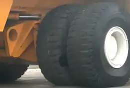 Установленные на самосвале радиальные бескамерные шины производства компании Michelin имеют размер 59/80R63 и вес 5,5 тонны — на момент постройки грузовика самые большие в мире.