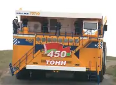 БелАЗ-75710 самый большой карьерный самосвал в мире, первая модель в новом классе машин особо большой грузоподъёмности. Представлен в сентябре 2013 года, а в январе 2014 года установил рекорд Гиннесса в странах Европы и Содружества Независимых Государств (СНГ), провезя по испытательному полигону груз весом в 503,5 тонны[3][4][5].
