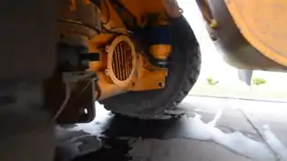 ![]() Поворотное устройство и гидроцилиндр управления вблизи | ![]() Вид с левой стороны на поворотные устройства мостов и гидроцилиндры рулевого управления |