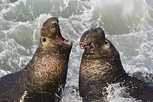 У берегов Калифорнии (в частности, в водах Фараллоновых островов) белые акулы обездвиживают северных морских слонов, сильно кусая их за заднюю часть тела, которая у них является основным движителем, а затем ждут, пока добыча истечёт кровью и умрёт. Обычно акулы выбирают в качестве мишени молодняк, поскольку взрослые особи, особенно доминантные самцы, могут представлять собой опасных противников, способных серьёзно травмировать хищника. Атака, как правило, происходит под водой, где жертва дезориентируется и начинает тонуть[71][72]. Отмечается, что акулы могут намеренно держать молодых морских слонов под водой, чтобы утопить их[72]. Размер акул, наблюдаемых у лежбищ морских слонов, как правило, варьирует от 3,46 до 5,48 м. В отличие от хищнической картины, наблюдаемой у Сил-Айленд, количество успешных нападений у Фараллоновых островов не изменяется в течение дня[65].