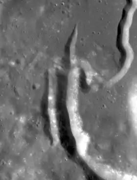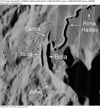 ![]() Бела — самое большое углубление в центре. Параллельная впадина слева — Тайзо; с заострённым концом сверху — Карлос, извилистая борозда справа вверху — борозда Хэдли. Снимок зонда Lunar Reconnaissance Orbiter, 2009 | |
