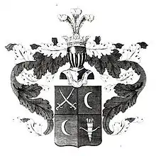 Щит разделен на четыре части, из них в первой части, в красном поле, крестообразно положены две серебряные сабли остриями вверх. Во второй и третьей части, в голубом поле, две серебряные луны, рогами в левую сторону обращенные. В четвёртой части, в красном поле, крестообразно означены золотой колчан со стрелами и лук.