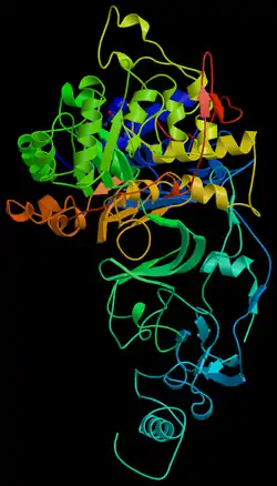 Третичная структура — пространственное строение полипептидной цепи. Структурно состоит из элементов вторичной структуры, стабилизированных различными типами взаимодействий, в которых гидрофобные взаимодействия играют важнейшую роль. В стабилизации третичной структуры принимают участие: