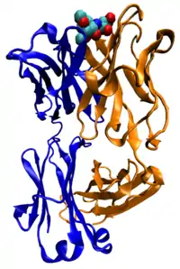 - Гликопротеины, содержащие в качестве простетической группы ковалентно связанные углеводные остатки; гликопротеины, содержащие остатки мукополисахаридов относятся к подклассу протеогликанов. В образовании связи с углеводными остатками обычно участвуют гидроксильные группы серина или треонина. Большая часть внеклеточных белков, в частности, иммуноглобулины относится к гликопротеинам. В протеогликанах углеводная часть составляет ~95 % от общей массы молекулы белка, они являются основным компонентом межклеточного матрикса;
