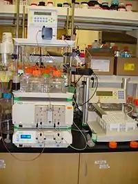 Короткие белки могут быть синтезированы химическим путём с использованием методов органического синтеза, например, химического лигирования[44]. Чаще всего химический синтез пептида происходит в направлении от C-конца к N-концу, в противоположность биосинтезу на рибосомах. Методом химического синтеза получают короткие иммунногенные пептиды (эпитопы), которые затем инъецируют животным с целью получения специфичных антител или гибридо́м. Кроме того, этот способ также используется для получения ингибиторов некоторых ферментов[45]. Химический синтез позволяет вводить в состав белков аминокислотные остатки, не встречающиеся в обычных белках, например такие, к боковым цепям которых присоединены флюоресцентные метки. Химические методы синтеза белков имеют ряд ограничений: они неэффективны при длине белка более 300 аминокислотных остатков, искусственно синтезированные белки могут иметь неправильную третичную структуру и у них отсутствую характерные посттрансляционные модификации (см. ниже).