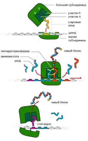 Во время начальной стадии трансляции, инициации, инициаторный (обычно метиониновый) кодон узнаётся малой субъединицей рибосомы, к которой при помощи белковых факторов инициации присоединена аминоацилированная метиониновая тРНК. После узнавания стартового кодона к малой субъединице рибосомы присоединяется большая субъединица, и начинается вторая стадия трансляции — элонгация. При каждом шаге рибосомы от 5'- к 3'-концу мРНК считывается один кодон путём образования водородных связей между ним и комплементарным ему антикодоном транспортной РНК, к которой присоединён соответствующий аминокислотный остаток. Образование пептидной связи между последним аминокислотным остатком растущего пептида и аминокислотным остатком, присоединённым к тРНК, катализируется рибосомальной РНК (рРНК), образующей пептидилтрансферазный центр рибосомы. Этот центр позиционирует атомы азота и углерода в положении, благоприятном для прохождения реакции. Третья и последняя стадия трансляции, терминация, происходит при достижении рибосомой стоп-кодона, после чего белковые факторы терминации гидролизуют связь между последней тРНК и полипептидной цепью, прекращая её синтез. В рибосомах белки всегда синтезируются от N- к C-концу[39].