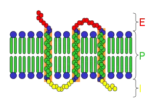 - Мембранные белки — имеют пересекающие клеточную мембрану домены, но части их выступают из мембраны в межклеточное окружение и цитоплазму клетки. Мембранные белки выполняют функцию рецепторов, то есть осуществляют передачу сигналов, а также обеспечивают трансмембранный транспорт различных веществ. Белки-транспортёры специфичны, каждый из них пропускает через мембрану только определённые молекулы или определённый тип сигнала.