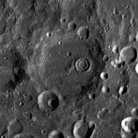 Ближайшими соседями кратера являются кратер Беркнер на западе-северо-западе; кратер Лауэ на севере; кратер Бартельс на востоке-северо-востоке; кратер Мозли на востоке; кратер Эйнштейн на юго-востоке; кратеры Хелберг и Робертсон на западе[2]. Селенографические координаты центра кратера 21°59′ с. ш. 96°32′ з. д.21,98° с. ш. 96,53° з. д., диаметр 86,3 км[3], глубина 2.8 км[1].