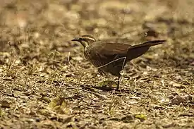 Мелкие беспозвоночные являются основным источником пищи, но иногда рацион дополняется небольшим количеством фруктов и семян. В течение сухого сезона вид потребляет меньшее количество пищи, чем в сезон дождей. Птицы ищут корм, медленно перемещаясь по земле, поднимая ветви и листья, и заглядывая под них. Иногда птицы ударяют по ветвям с рыхлой корой или скрученным листьям, чтобы вспугнуть свою жертву. Обнаруженные животные немедленно поедаются или преследуются на коротком расстоянии. Особенно в засушливое время года птицы зондируют клювом слой листьев, чтобы добраться до живых беспозвоночных.