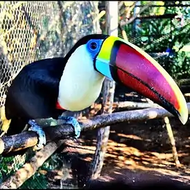 Белогрудый тукан — это тропическая птица, обитающая во влажных лесах Амазонки на северо-востоке Южной Америки. Его легко заметить среди деревьев из-за ярко окрашенных головы и клюва. Бо́льшая часть клюва красная, в окраске оперения преобладают чёрный и белый цвета, а сам тип окраски таков, что создаётся контраст между тёмным туловищем и светлой головой и грудью. Массивный клюв делает тукана хорошо отличаемой птицей, а громкий голос позволяет определить местоположение. В рацион питания входят различные фрукты, а также насекомые, ящерицы, змеи, и даже яйца и птенцы.