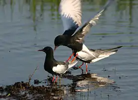 У брачного наряда голова, шея и спина чёрного цвета. Надхвостье, хвост и задние края крыльев белого цвета. Крылья сизые, на переднем крае крыла белая полоса сверху и чёрная — снизу. Длинный заострённый клюв красновато — чёрного цвета. Лапы короткие и слабые красного цвета.