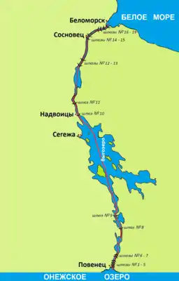 Канал начинается у посёлка Повенца в Повенецкой губе Онежского озера и заканчивается у города Беломорска в Сорокской губе Белого моря.