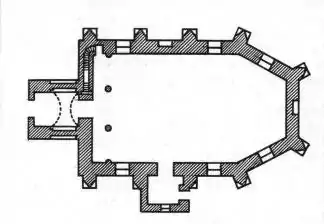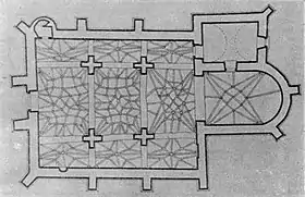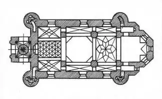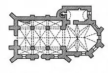 Внутри пространство основного объёма разделено на три нефа, из которых боковые вдвое уже центрального, но равны ему по высоте. Все травеи, перекрыты крестовыми с нервюрами сводами[9].