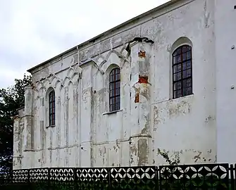 Церковь Святителя Николая (вторая половина 1510-х — начало 1520-х гг.) — первоначально (до перестроек середины XVIII — XX вв.) трёхнефное, трёхпрясловое, зальное сооружение с трёхчастным полукруглым алтарём и квадратной в плане башней-колокольней, прилегающей к юго-западному углу, перекрытое остроконечной кровлей, на коньке которой размещалась деревянная главка[18][2].