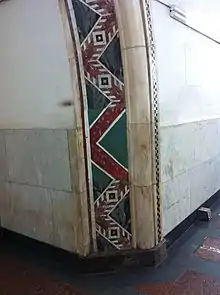 Пилоны облицованы светлым мрамором «коелга»[14]. Они гармонично расширяются вверх, но не переходят в своды, а отделяются от них простыми по форме элегантными карнизами[15]. Путевые стены изначально были облицованы мелкой цветной метлахской плиткой[14], при реконструкции — белой керамической плиткой[1]. На путевых стенах под основанием свода размещены пилястры[15]. Так как проектирование станции было поручено Таранову и Быковой, которые были супругами, они решили реализовать свои неосуществлённые при строительстве «Белорусской»-радиальной замыслы[16]. Так, они сделали декоративный узор на полу в виде традиционной белорусской вышивки[16]. Первоначально его выполнили из многоцветной (серой, белой и красной) керамической плитки[16]. При реконструкции, проведённой в 1994 году, плитка была заменена на полированный гранит[14] со значительным упрощением оригинального узора[17]. Светильники, размещённые на пилонах, выполнены в виде ваз из стекла и мрамора.