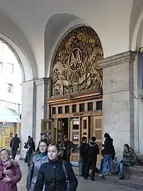 У станции два вестибюля — наземный и подземный. Первый (западный, наземный) вестибюль открылся в 1952 году (архитекторы: Н. А. Быкова, А. А. Марова, И. Г. Таранов, З. Ф. Абрамова, Я. В. Татаржинская, художник Г. И. Опрышко, скульптор С. М. Орлов, С. Л. Рабинович, И. Л. Слоним), второй (восточный, подземный) — в 1997 году.
