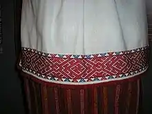 Самым важным декоративным элементом мужского костюма с давних времён был пояс, считавшийся одним из главных оберегов человека и сопровождавший его во всех жизненных проявлениях от рождения до смерти[76]. Археологи находят металлические поясные пряжки и разнообразной формы бляшки от поясных наборов, датируемые VI—IX вв.: круглые, прорезные, украшенные орнаментом[77]. Опоясывание новорождённого человека символизировало собой факт его приобщения к обществу. Красный цвет пояса обещал члену сообщества наилучшие пожелания судьбы, счастья и здоровья.