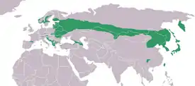 Северная граница ареала проходит через среднюю часть тайги, постепенно смещаясь к югу с запада на восток. Гнездится к северу в Скандинавии до 66° с. ш., в европейской части России до 60° с. ш., на Урале до 61° с. ш., в Западной Сибири до 60° с. ш., восточнее до 56—58-й параллелей. Северо-восточная окраина ареала находится в южной части побережья Охотского моря в районе села Аян. Южная окраина гнездовий проходит через лесостепи, местами захватывая степную зону. На Украине и западе России основной ареал находится севернее Волыно-Подольской возвышенности, районов Киева, Днепра, Воронежа, Сызрани.[8] В Казахстане распространён в долине Урала к югу до 49-параллели, в Кокчетавском нагорье, в долине Иртыша, на Юго-Западном Алтае и в долине Чёрного Иртыша.[9] Восточнее южная граница ареала проходит через Монголию и Китай — к югу до долины Урунгу, Хангая, Хэнтэя, южной части Большого Хингана, северо-западного побережья Ляодунского залива. Изолированные участки ареала отмечены на западе китайской провинции Сычуань и северо-западе провинции Фуцзянь. За пределами материка гнездится на Шантарских островах, Сахалине, Шикотане, Кунашире, Японских островах и Тайвани.[8]