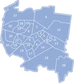 Город состоит из 28 административных единиц (оседле). Первые 27 оседле были созданы 25 октября 2004 года постановлением городского совета № XXXI/331/04[29], 28-я оседле, Дойлиды Гурне, была создана 23 октября 2006 года после включения в состав города трёх деревень.