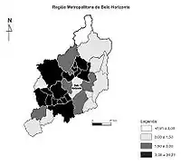 В агломерацию входят 34 муниципалитета, в том числе: Белу-Оризонти, Бетин, Контажен, Рибейран-даж-Невеш, Санта-Лузия, Сабара, Сабара, Веспазиану, Ибирите и другие.