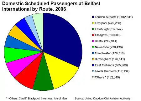 - Рост пассажирооборота: Международный аэропорт Белфаста обслужил 5,015,000 пассажиров в 2006 году[2], что является самым высоким показателем в Северной Ирландии. Аэропорт показывает положительную динамику роста пассажирооборота, взлётов и посадок и грузооборота в течение последних 10 лет.