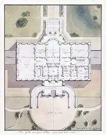 Дом Президента был основной функцией плана Пьера (Питера) Шарля Ланфана относительно недавно установленного федерального города Вашингтона, округ Колумбия (см.: L’Enfant Plan)[11][12]. На конкурсе дизайнеров был выбран архитектор Белого дома, после чего он получил девять предложений, а также один, представленный анонимно Томасом Джефферсоном[13][14].