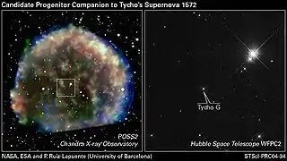 - Достаточно длительная и интенсивная аккреция на массивный белый карлик приводит к превышению его массой предела Чандрасекара и термоядерному взрыву, наблюдаемому как вспышка сверхновой типа Ia. Примером такого события является взрыв сверхновой SN 1572.