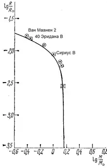 где — его плотность, то есть, в отличие от уравнения Клапейрона (уравнения состояния идеального газа), для вырожденного электронного газа температура в уравнение состояния не входит — его давление от температуры не зависит, и, следовательно, строение белых карликов не зависит от температуры. Таким образом, для белых карликов, в отличие от звёзд главной последовательности и гигантов, не существует зависимость масса — светимость.