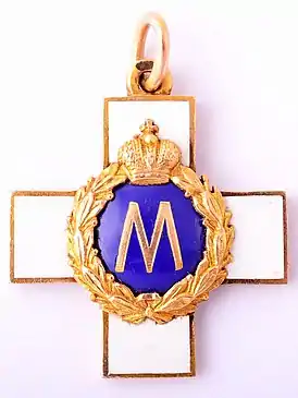 ![]() Жетон члена «ОБК» (вензель «М» нанесён в честь Великого Князя Михаила Александровича — покровителя общества «Белый крест») | |