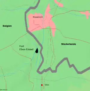 Бельгия возлагала большие надежды на форт Эбен-Эмаль. Германское верховное командование также признавало стратегическое значение форта и поэтому ещё за год до начала военных действий против Бельгии разработало план военно-воздушной операции по захвату и нейтрализации форта[36]. 10 мая 1940 года подразделения немецких десантников с помощью планёров были высажены на территории форта Эбен-Эмаль[69]. Затем, используя кумулятивные заряды, они стали планомерно уничтожать казематы форта, подавляя очаги сопротивления с помощью огнемётов, гранат и автоматического оружия[70].
