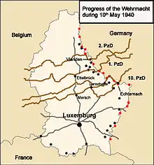 Далее были проведены немецкие воздушные операции в Люксембурге, захвачены 5 переправ и путей сообщения, ведущих в центральную Бельгию. Наступление проводили 125 добровольцев из 34-й пехотной дивизии под командованием Вайнера Гейдриха. Воздушная транспортировка была осуществлена с помощью Fieseler Fi 156 Storch. Было потеряно 5 самолётов и 30 человек убитыми[72].