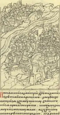![]() Дмитрий Фёдорович Бельский произносит речь перед русскими полками в походе 1541 г. | |