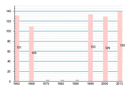 | 1962 | 1968 | 1975 | 1982 | 1990 | 1999 | 2006 | 2008 | 2011 | 2012 | 2013 |