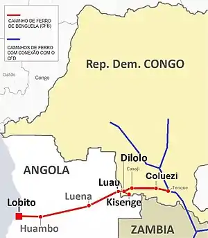 Железная дорога Бенгела (порт. Caminho de Ferro de Benguela), также называемая железной дорогой Катанга-Бенгела,[1] - железнодорожная линия, проходящая через центральную часть Ангола и юг Демократическая Республика Конго с запада на восток и являющаяся крупнейшей и наиболее важной железной дорогой на юго-западе Африки. Она служит для соединения города Тенке, Конго, с Железная дорога Кейптаун — Каир (Кинду-Конго до Порт-Элизабет-Южно-Африканская Республика).[2]
