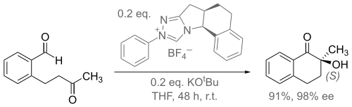 В одном исследовании, специально разработанный N-гетероциклический карбен (NHC основание, связанное с солью тиазола) был использован, для облегчения энантиоселективной внутримолекулярной конденсации бензоина (схема 2)[6].