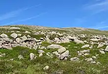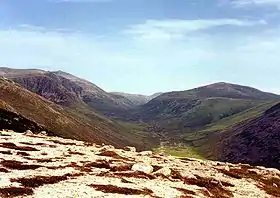 ![]() Вид от Глен-Дерри вверх на склон Дерри-Кернгорм. Бенн-а-Хаорейн виден справа. | |