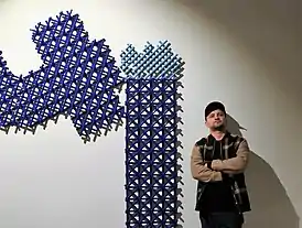 Брутальные и лаконичные работы скульптора наполнены иронией, переходящей в критику и обратно. Используя в качестве основного материала арматуру, скульптор создает предельно конкретные образы-символы или эмблемы, сопоставляет их между собой и предлагает зрителю заново взглянуть на привычные вещи[30].