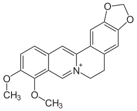 Берберин (ранее также ямаицин и ксантопикрит) — алкалоид состава C20H17NO4, содержится в различных частях многих растений, принадлежащих к разнообразнейшим семействам, так что с этой стороны может считаться одним из распространенных в растительном царстве. Кроме барбариса (Berberis vulgaris), он найден в корнях коломба (Radix Colombo), принадлежащем растению Cocculus palmatus Dec., в коре Geoffroya inermis и Xanthoxylum clava Herculis (откуда его прежние названия ямаицин и ксантопикрит) и т. д. В настоящее время его получают из корней культивируемого лекарственного растения Coptis chinensis.[1]