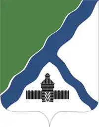 Герб представляет собой зелёный и серебряный щит, на котором имеется широкая лазоревая волнистая перевязь, окаймлённая сверху серебром и соединённая с другой более узкой лазоревой волнистой перевязью, положенной в серебряном поле. Внизу чёрный острог с палисадом и одной двухъярусной башней с серебряными закрытыми воротами.