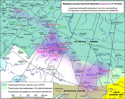 Крестьянин д. БЕРДЮКИНСКАЯ на роднике ВАХРОМЕЙКО ЛЕОНТЬЕВ сын БЕРДЮКИН, 1623.[21] В написании БЕРДЮКИН фамилия известна в XVII в. и в Верхотурском уезде: в Ницинской слободе жил ямщик КИРИЛЛ ВАРФОЛОМЕЕВИЧ (ВАХРОМЕЕВ) БЕРДЮКИН, уроженец Соликамского уезда, перебравшийся на Средний Урал в 1632/33 г. (возможно, это был сын упоминавшегося выше В. Л. БЕРДЮКИНА); в д. Ереминой в той же слободе — крестьянин ДМИТРИЙ (МИТКА) ГРИГОРЬЕВИЧ БЕРДЮКИН с братьями МИХАИЛОМ, ЕВСЕЕМ и ПЕТРОМ; в д. Коморниковой (Ирбитская слобода) — крестьяне братья ДМИТРИЙ (МИТКА) и ФИЛИПП ВАСИЛЬЕВИЧИ БЕРДЮКИНЫ (перепись 1680 г.); ср.: МИТКА БЕРДЮКИН, крестьянин, 1671 (Тупиков).