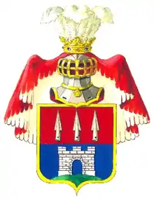 Щит разделён горизонтально на две части, из коих в верхней в красном поле изображены три серебряные копейные конца. В нижней части в голубом поле, поставлена на земле серебряная крепость о трёх зубцах.