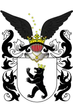 В серебряном ноле медведь в короне, поднявшийся на дыбы, вправо.