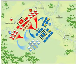 20 (30) июня утром король, который молился всю ночь, выстроил свою армию в таком порядке: правое крыло — гетман Потоцкий, левое — гетман Калиновский. В центре, где преимущественно строится польская и немецкая пехота — сам король. Мосты через Стыр разбираются.