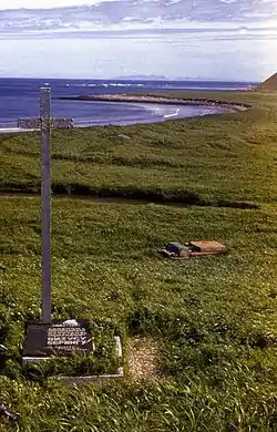 В 1874 году представители Российско-Американской компании поставили деревянный крест примерно на том месте, где предположительно должна была находиться могила великого мореплавателя. Позднее местные исследователи установили нынешний памятник — два наложенных друг на друга каменных прямоугольника, покрытые сверху чугунной плитой. Надгробие венчает железный крест высотой 3,5 м.