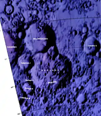 ![]() Снимок зонда Lunar Reconnaissance Orbiter. Кратер Берлаге в центре снимка | |