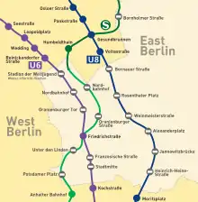 Особым образом были перекрыты линии S1 и S25. Они стали транзитными, соединяющими одну часть Западного Берлина с другой, проходя под Восточным сектором. С севера станция Schönholz, располагавшаяся в Западном секторе, оставалась открытой, далее следовавшая станция Bornholmer Straße, находясь уже в Восточном секторе в приграничном со стеной районе, была закрыта и являлась транзитной, следующая станция Gesundbrunnen, выходившая вновь на участок Западного сектора, была открытой и являлась одновременно пересадочным узлом с одноименной станцией метро линии U8, станция Humboldthain, опять же находившаяся в Западном секторе, тоже была открытой, а следующие четыре станции, расположенные уже в Восточном секторе: Nordbahnhof — Oranienburger Straße — Unter den Linden — Potsdamer Platz, опять же были закрытыми и транзитными. Станция Friedrischtraße, располагавшаяся между станциями Oranienburger Straße и Unter den Linden, также располагалась в Восточном секторе, но имела особый статус контрольно-пропускного пункта. С неё можно было попасть в Восточный Берлин, а также пересесть на одноимённую станцию метро линии U6, также одновременно являвшейся КПП в Восточный Берлин. Если в случае с метрополитеном большая его часть осталась в Западном секторе, то в случае с городской электричкой вышло наоборот: большая часть линий осталась в Восточном секторе.