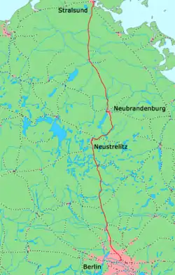 Участок Биркенвердер (станция) — Нойштрелиц обновляется в рамках существующих инвестиций с целью совершенствования железнодорожного сообщения между Берлином и Ростоком со средней скоростью 160 км/ч и выше при нагрузке на ось до 25 тонн.[8] Участок будет оснащён устройствами сигнализации, централизации и блокировки в соответствии с европейской системой управления движением поездов[9]. Реализовать комплексный проект, когда участок будет пригоден к движению, предусмотрено к 2013 году.[10] Общая сумма расходов на расширение в совокупности 198 километров путей была озвучена в 2005 году и равнялась 838 миллионам евро[11], затем, в 2012 году уточнённая сумма составила 850 млн евро.[9]